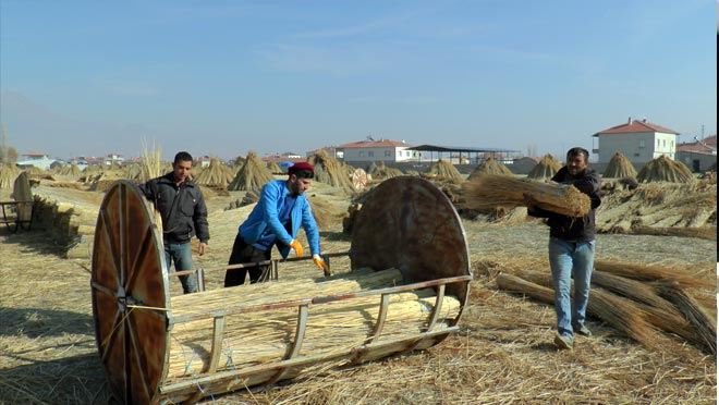 Kamış işletmecisi Turgut Tuna kamış toplama işinin zor bir uğraş olduğuna vurgu yapıp Kasım ayının ortalarında başladığını hatırlatarak şunları kaydetti. “Mahallemizin insanların Kasım ayının ortası geldiği zaman Sultan Sazlığında kamış kesimine başlar. Kamışın kesilebilmesi için ağaçlaşmış bir vaziyete gelmesi gerekiyor. Sert bir halde üzerinde bir yaprak olmaması lazım. Bu durumda kamışın soğuğu iyice yemesi ile oluşuyor. Hava soğuk olunca kamış yaprağını döküyor ve içerisindeki suyu atarak, ağaçlaşmış bir vaziyete geliyor. Bunun oluşması için soğukluk seviyesini eksi 5’leri bulması gerekiyor. Bu Aralık ayının 20’si gibi eksi 20 derecede buzun üzerinde kamış kesimi yaptığımız yıllar oldu. Buzun üzerinde kesim yaptığımız zaman daha kaliteli ürün elde ediyoruz. Yani soğuğun derecesi arttıkça kamış, ağaçlaşma evresini daha iyi gerçekleştirmiş oluyor”