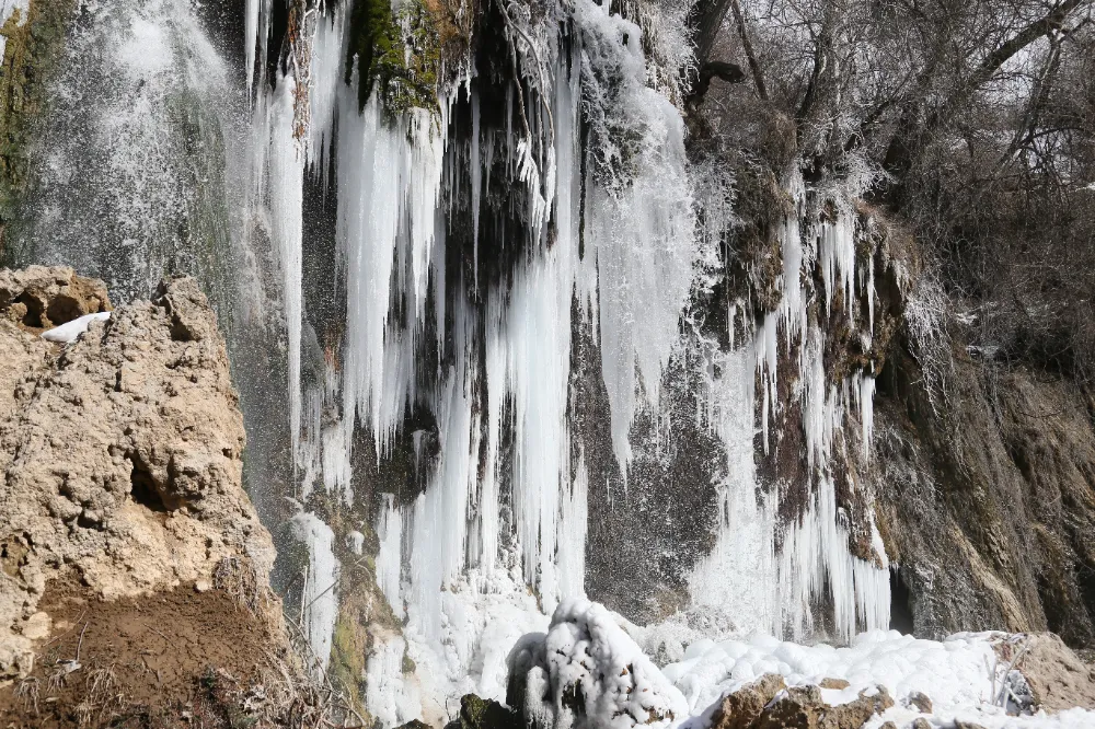 Şelalede oluşan 3-4 metre uzunluğundaki buz sarkıtları güzel görüntü oluşturdu.