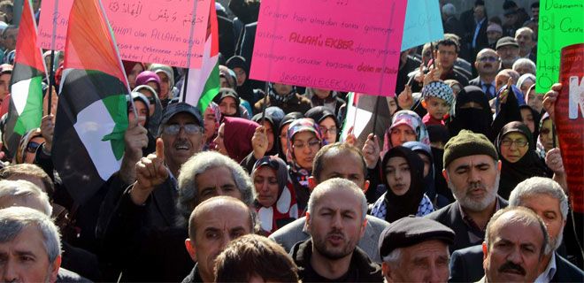 Taşıdıkları `Kahrolsun İsrail` pankartları ile slogan atan grup Siyonist İsrail askerlerinin Mescid-i Aksa’ya saldırlarını ve işgallerini protesto ettiler. Protestocu grup adına bir konuşma yapan Kayseri Kardeşlik ve İyilik Platformu sözcüsü Ahmet Kurt, "1948 yılında siyasal otoritesini yitirmiş, Ulus ve mezhepçi devletlerin kurulduğu ve başlarına da iş birlikçi aktörlerin getirilmesinin verdiği boşluktan yararlanan siyonistler İslam ümmetinin kalbine bir hançer gibi saplanarak müminlerin 3 kutsalından biri olan Mescid-i Aksa`nın bulunduğu topraklarda İsrail devletini kurmuşlardır. Rabbimizin etrafını Bereketli kıldığı, Kulu ve Resulünü bir gece yeryüzünde ki bilinen tevhid sembolü olan İbrahim ve İsmail Peygamberlerin inşa ettiği ilk mescid olan Mescid-i Haram`dan alarak gücün ve devletin simgesi Davut ve Süleyman peygamberlerin inşa ettiği Mescid-i Aksa`ya götürdüğü topraklar bugün siyonistlerin işgali altındadır" değerlendirmesinde bulundu…