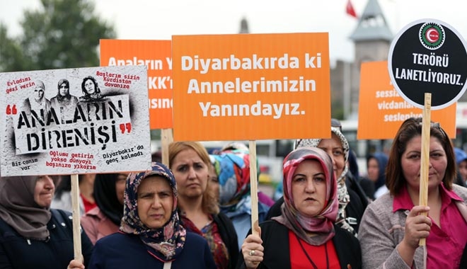 Diyarbakır Anneleri´ne destek için omuz omuza veren kadın protestocular adına bir konuşma yapan İstanbul Beşiktaş´taki hain bombalı saldırıda şehit düşen Polis Memuru Yasin İke´nin ablası Keziban Eser, annelerin 23 günlük sessiz eyleminin bir dur çığlığına dönüştüğüne dikkat çekip, Diyarbakır´daki annelerin başlattığı eylemin teröre en büyük darbeyi vuracağına inandıklarının altını çizerek ?Bizler, bugün burada sivil toplum kuruluşlarının kadın temsilcileri olarak, annelerin Diyarbakır´da başlattığı onurlu direnişlerine destek olmak üzere 81 ilde eş zamanlı olarak toplanmış bulunmaktayız. Bu direnişin teröre en büyük darbeyi vuracak iradeyi ortaya koyduğuna yürekten inanıyoruz. Tarih, Diyarbakır´daki anneleri ve teröre meydan okuyan direnişlerini saygı ile yazacaktır. Bulundukları şehirlerde, siyasi ve toplumsal yalnızlaştırılma dahil, her şeyi göze alıp evlatlarının dönmesini isteyen anneler, başka canlar yanmasın diye çıktıkları yolda inşallah zafere ulaşacaklardır. Günlerdir yaşanan evlat nöbetlerinde, tarifi imkânsız acılara şahit oluyoruz. ?Evladımın ölüsüne bile razıyım´ diyen annelerin masum ve insani direnişinin yanında olmak, hepimizin boynunun borcudur. Bizler Edirne´den Kars´a, tek yürek olmuş kadınlar ve anneler olarak anne acısının etiketi olmaz diyor, yerel, ulusal ve uluslararası kamuoyunu Diyarbakır´daki annelerin yanlarında olmaya davet ediyoruz. Ülkemizin geleceğine, refahına, birlik ve beraberliğine zarar vermeye çalışan terör örgütlerine ve siyasi uzantılarına karşı yıllardır topyekûn mücadele içerisindeyiz. Vatan uğruna verdiğimiz şehitlerin kanı, evlatlarımız için döktüğümüz gözyaşı hala kurumadı. Bu mücadelemize bir mihenk taşını da dağa kaçırılan evladını geri almak için teröre yeter diyen Hacire Annemiz ekledi. Gördük ki yanan bir anne yüreği tüm acılara, göz yaşına ve gencecik fidanların ölümüne son verebilir. Bu duruş ve cesaret, terör örgütünün ağına düşmüş her evlada ve annesine umut oldu. 3 Eylül´den bu yana tam 23 gündür Diyarbakır´da yeni annelerin katılımı ile büyüyen bu sessiz çığlık, dünya üzerindeki terörün tümüne ?Dur´ diye haykıran güçlü bir sese dönüştü. İnanıyoruz ki, azimle seslerini yükselten kadınlar, terör örgütlerinin hain emelleri için Fırat´ın ve Dicle´nin kuzularının kurban edilmesine izin vermeyecektir. Duyduğumuz ?yeter artık´ feryadına destek vermek, safları sıklaştırmak, bir ve beraber olduğumuzu göstermek, evlatlarımıza ve geleceğimize sahip çıkmak hepimizin vicdani borcudur. Diyarbakır´da toplanan annelerin günlerdir ve hatta yıllardır süren mücadelesinde, kadınlar olarak tek yürek ve tek dua olduk. Biz de bugün kadın sivil toplum temsilcileri olarak, Diyarbakır´da evlat nöbeti tutan annelerin yanında bedenen olamasak da onların ?ne pahasına olursa olsun´ diyerek teröre karşı gösterdikleri kararlı duruşlarının yanındayız. Annelerin başlattığı bu hareket karşısında karanlık yapıların yıkılacağına gönülden inanıyoruz. Ailelerimizin bir an önce evlatlarına kavuşmalarını diliyor ve evlat nöbetindeki annelerle birlikte teröre son diyoruz? diye haykırdı.