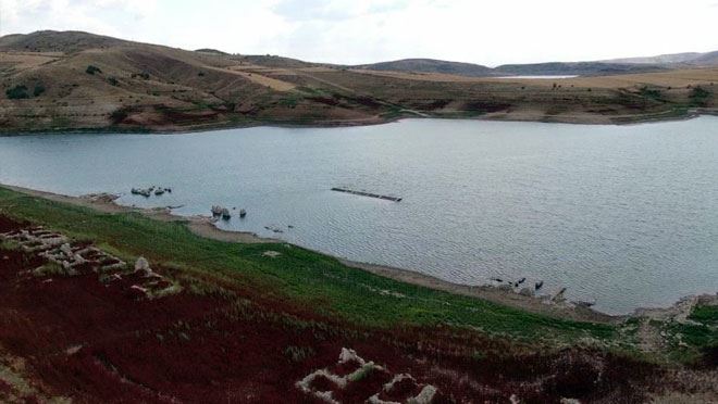 Kayseri’nin Kocasinan ilçesinde baraj sularının çekilmesiyle beraber su altında kalan eski Mollahacı köyünün bir kısmı gün yüzüne çıktı.