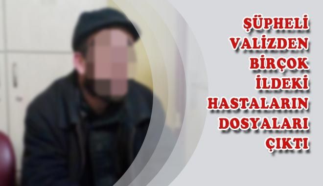 Kayseri Eğitim ve Araştırma Hastanesi´nin bahçesine bırakılan şüpheli valizden, Türkiye´nin dört bir yanında tedavi gören hastaların dosyaları çıktı. Valizin, akli dengesi bozuk Gökhan D.´ye (35) ait olduğu belirlendi. Gözaltına alınan şüpheli, polisin, "Bu dosyaları neden topladın?" sorusuna "Dosyalar hoşuma gidiyor" diye yanıt verdi.