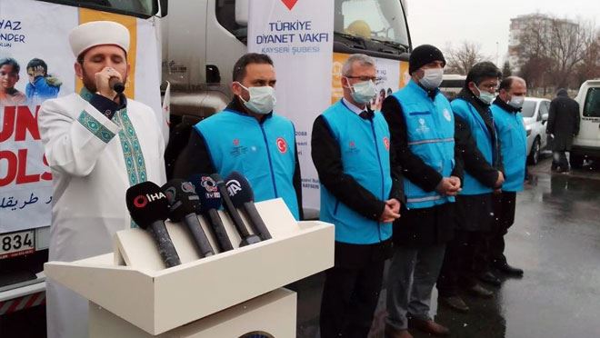 Ahmet Ayşe İnci Camii’nde cuma namazına müteakip düzenlenen uğurlama töreni, Kuran-ı Kerim tilaveti okundu. Ardından bir konuşma yapan Kayseri İl Müftü Yardımcısı İl Mehmet İzci 2016 yılından bugüne kadar 710 tır yardım malzemesinin Suriye’deki kamplarda zor durumda olan insanlara gönderildiğini söyleyerek, “Kayseri’de ‘Yolun iyilik olsun’ kampanyası ve birçok kampanya ile Mart 2016’dan bugüne kadar hayırseverlerimizin katkılarıyla 710 tır yardım malzemesini, Suriye’deki kamplarda zor durumda yaşayan mağdur ve muhtaç kardeşlerimizin yaralarını sarmak ve ihtiyaçlarını gidermek için bölgeye gönderdik. Bugün göndereceğimiz 2 tır un ve 1 tır kömür, soba, kıyafet, ayakkabı, gıda, su, battaniye, yorgan, bebek malzemelerinden oluşan toplam 3 tır yardım malzemelerimiz ile toplamda 749 bin 250 TL değerindeki yardımımızı gönderiyoruz. Bu göndereceğimiz yardımlardan 2 tır un Kilis Öncüpınar sınır kapısında bulunan koordinasyon merkezimize ulaşacak. Suriye’nin Azez kenti başta olmak üzere çevre bölgelerdeki muhtaçların sofralarına ekmek olarak ulaştırılacaktır. Diğer tırımız ise Hatay Cilvegözü sınır kapısında bulunan koordinasyon merkezimize ulaşacak. Suriye’nin İdlib kenti başta olmak üzere çevre bölgelerdeki muhtaçların ihtiyaçlarını gidermek için kullanılacak” ifadelerini kullandı.