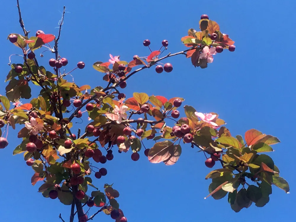 Misket büyüklüğünde meyve veren süs elmasının meyvesiyle birlikte çiçek açtığı görüldü.