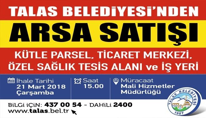 Mülkiyeti Talas Belediyesi´ne ait bir adet dükkan, 1 adet sağlık tesisi, 1 adet ticaret arsası, 1 adet kütle parsel ve diğer 6 adet kira alanları için 21 Mart´ta yapılacak olan ihale saat 15.00´de başlayacak.