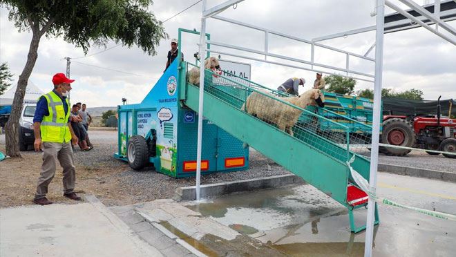 Talas Belediyesi kurduğu koyun yıkama banyoluğu ile kurban pazarında satışa sunulan tüm koyunları ücretsiz yıkayıp dezenfekte ediyor.