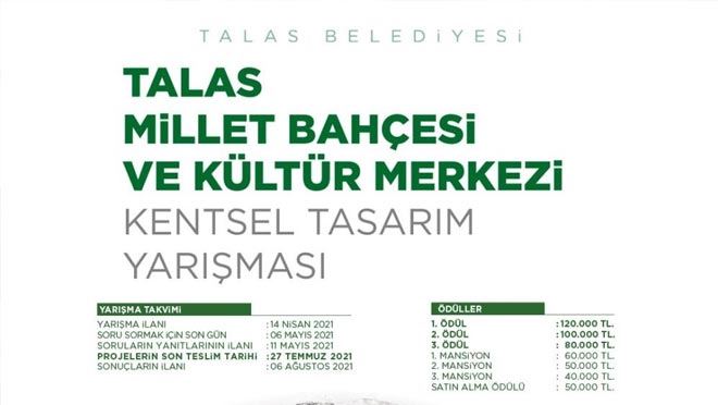 Talas Belediyesi tarafından İl Jandarma Komutanlığı içindeki 100 bin metrekarelik alana yapılacak Millet Bahçesi için uygulanacak proje düzenlenen fikir yarışmasıyla belirlenecek. Türkiye’de ilk kez bir Millet Bahçesi projesi için düzenlenen yarışmaya başvurular başladı.