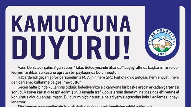 “Azim Deniz adlı şahıs 3 gün süren “Talas Belediyesinde Skandal” başlığı altında başkanımızı ve belediyemizi itibar suikastına uğratan bir paylaşımda bulunmuştur. Haberde adı geçen şoför personelimiz M. A.’nın hem SRC Psikoteknik Belgesi, hem ehliyeti, hem de ticari araç kullanma belgesi mevcuttur. Geçen hafta içinde kullanmış olduğu belediyemize ait kamyona bir başka aracın arkadan çarpması sonucu kazaya karıştığı tespit edilmiştir. O esnada trafik polislerinin denetimi neticesinde ehliyetine el konulmuş olduğu anlaşılmıştır. Bu durum hiçbir suretle belediyemiz açısından kabul edilemez, onaylanamaz.