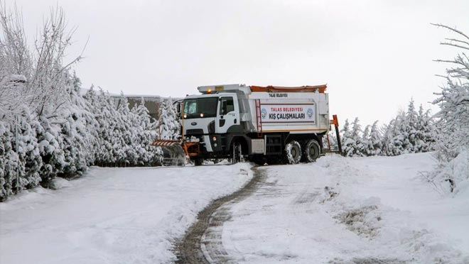 Havanın soğumasıyla beraber başlayan yoğun kar yağışı sonrası Talas Belediyesi de kış çalışmalarına yeniden hız verdi. 42 araç, 7 ekip ve 90 personel ile 2 vardiya halinde sürdürülen kar kürüme, temizleme ve tuzlama çalışmalarında greyder, kepçe, kar kürüme kamyonları, mini kaldırım kürüme kepçesi ve süpürme araçlarıyla hummalı bir çalışma gerçekleştiriliyor.