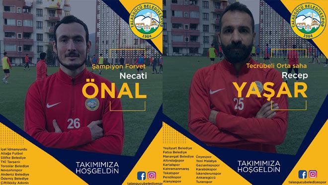 Talasgücü Belediyespor geçen sezon İçel İdman Yurdu forması giyen forvet Necati Önal’ı ve Malatya Yeşilyurt Belediyespor forması giyen tecrübeli orta saha oyuncusu Recep Yaşar’ı transfer etti.