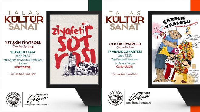 Her iki tiyatro gösterisi de Kayseri Üniversitesi Konferans Salonu’nda gerçekleşecek ve Talas Belediyesinin tüm kültür sanat etkinliklerinde olduğu gibi ücretsiz olarak takip edilebilecek.