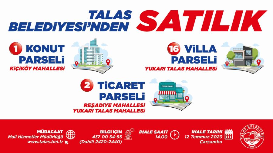 Bu ihaleden sonra Yukarı Talas’ta bulunan 16 adet villa parselinin satış ihalesine geçilecek. Bu parsellerin muhammen bedeli 1 milyon 500 bin ile 3 milyon lira arasında olacak.