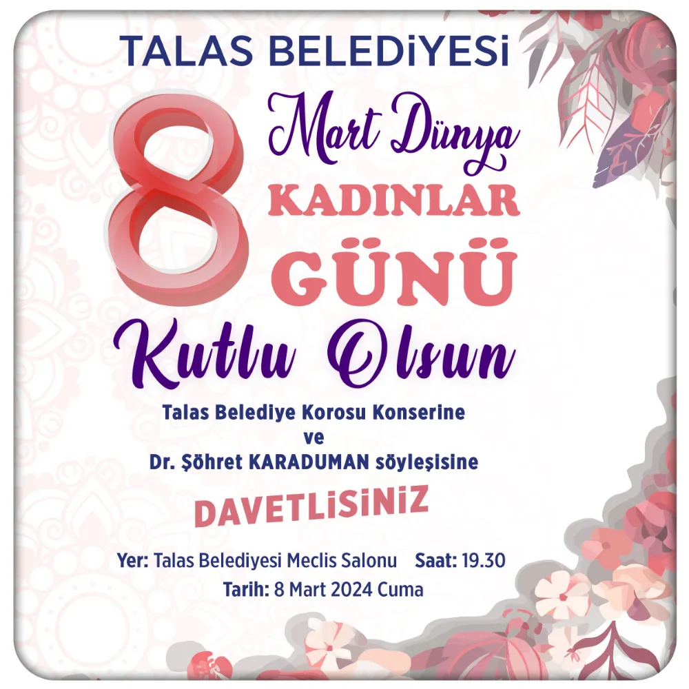 Talas Belediyesi tarafından 8 Mart Dünya Kadınlar Günü nedeni ile Talas Belediye Korosu konseri ile Nörobilim Uzmanı Dr. Şöhret Karaduman söyleşisi düzenlenecek.