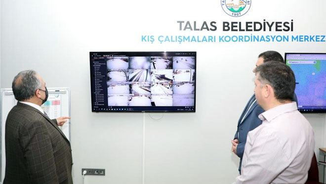 Talas Belediye Başkanı Mustafa Yalçın, devam eden kış çalışmalarını Kış Çalışmaları Koordinasyon Merkezi’ndeki canlı kameralar üzerinden inceledi.