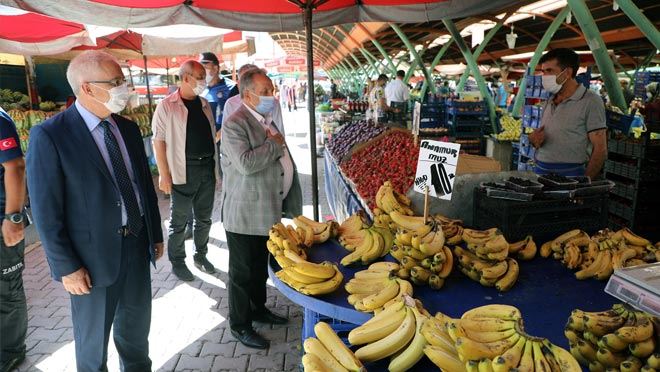Talas Kaymakamı Yaşar Dönmez ve Belediye Başkanı Mustafa Yalçın birlikte gezerek başta pazar yeri olmak üzere sirkülasyonun yoğun olduğu yerlerde Maske, Mesafe ve Temizlik uyarısında bulundu.
