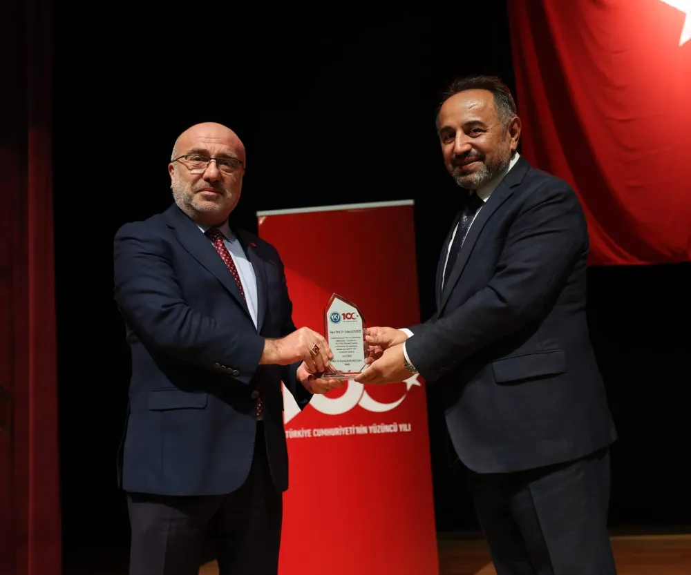 Konferansın ardından Rektör Prof. Dr. Kurtuluş Karamustafa, konferansın konuşmacısı Prof. Dr. Tufan Gündüz’e plaket takdim etti.