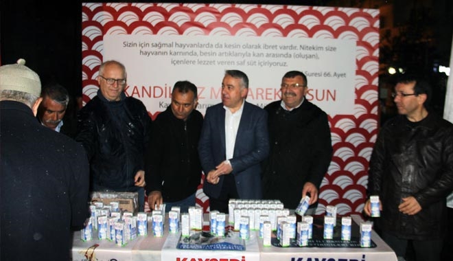 Tarım ve Orman Bakanlığı, süt tüketimini arttırmak ve bu konuda farkındalık oluşturmak için, tüm illerde kandil gecesi yatsı namazı çıkışında süt dağıtımı gerçekleştirdi. Kayseri Hunat Caminde namaz çıkışı İl Tarım ve Orman Müdürü Mustafa Şahin vatandaşlara süt dağıttı. Süt tüketimine ilgiyi arttırmak için tüm illerde süt dağıtımı yapıldığını söyleyen Mustafa Şahin, ?Bakanlığımız her kandilde olduğu gibi, bu kandilde de tüm il ve ilçe müdürlüklerimize merkezi camilerimizde süt dağıtılması konusunda talimat verdi. Biz de Kayseri İl Müdürlüğü olarak, birçok ilçemizle birlikte bu gece yatsı namazına müteakip süt dağıtımını yapmaya başladık. Ben özelikle Damızlık Sığır Yetiştiriciler Derneğine, süt desteği konusunda yardımlarını esirgemedikleri için teşekkür ediyorum. Bununla birlikte, diğer ilçelerimizde de süt birliklerimiz vatandaşlarımıza bu özel gecede süt ikramında bulundular. Kur´an suresinde de, Allah bize sütle alakalı neler olduğunu bize anlatıyor. Biz de bu gecenin bereketinden faydalanabilmek için, bakanlığımız ve Kayseri İl Teşkilatı olarak vatandaşlarımıza süt ikramımızı yapıyoruz. Böylece hem bir farkındalık oluşturuyoruz vatandaşlara süt içirmeye çalışarak hem de ikramda bulunmuş oluyoruz? ifadelerinde bulundu.