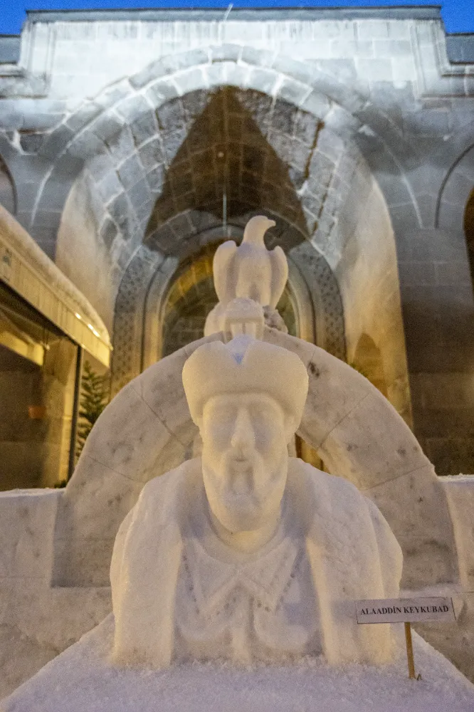 Büyükşehir Belediyesinden yapılan açıklamaya göre, tarihi medresenin kapısından içeri girenleri karşılayan 1. Alaeddin Keykubad'ın kardan heykeli, ilgi çekiyor.