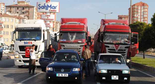 . Yolu trafiğe kapatan TIR şoförleri, kornalara basarak terör örgütünü protesto etti. Şoförler, Mimar Sinan yolunda metrelerce ilerlemesinin ardından, araçlarından inerek İstiklal Marşı okudu.