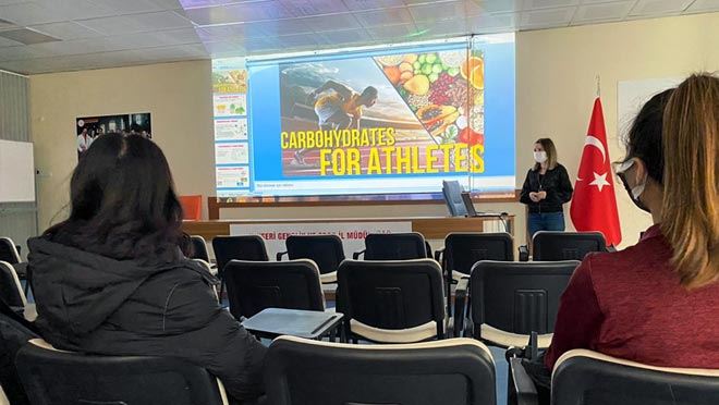 TOHM sporcularına eğitim. Uzman Sevil Koçak tarafından sporculara dengeli ve sağlıklı beslenme anlatıldı.