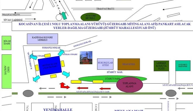 ?1. toplanma alanı: Zümrüt Mahallesi Mustafa Kemal Paşa Bulvarı üzeri, Zümrüt Parkı başlangıcı, yürüyüş güzergahı: Mustafa Kemal Paşa Bulvarından Fuar önüne kadar olan güzergah, toplantı alanı: Fuar önü açık otoparkı, pankart asılacak yerler: yürüyüş güzergahı üzerinde bulunan karşılıklı elektrik direkleri arası, afiş yapıştırılacak yerler: reklam panoları bulunan otobüs durakları ile reklam panoları olarak kullanılan yerler;