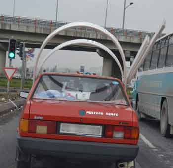 Sivas yolunda, bir otomobil sürücüsünün uzun kornişleri otomobiliyle taşıması dikkat çekti. Otomobil sürücüsünün kornişleri arka koltukta bulunan her iki cama yerleştirdiği görüntü objektife bu şekilde yansıdı.