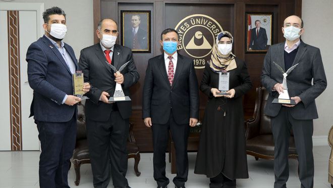 Türkiye Bilimsel ve Teknolojik Araştırma Kurumu (TÜBİTAK) Bilim, Özel, Hizmet ve Teşvik Ödülleri ile Türkiye Bilimler Akademisi (TÜBA) Uluslararası Akademi Ödülleri kapsamında ödüle layık görülen ve Cumhurbaşkanı Recep Tayyip Erdoğan tarafından ödülleri tevdi edilen Erciyes Üniversitesi (ERÜ) Öğretim Üyeleri Rektör Prof. Dr. Mustafa Çalış’ı ziyaret etti.
