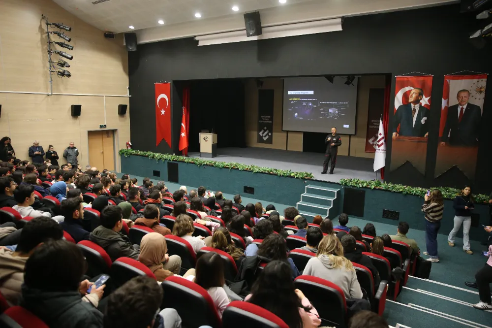 Gezeravcı, Yabancı Diller Yüksekokulu Konferans Salonu'nda gerçekleştirilen programda öğrencilere, Türkiye Milli Uzay Programı ve insanlı ilk uzay misyonu hakkında bilgi verdi.
