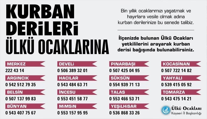 Ülkü Ocakları Kayseri İl Başkanı Volkan Çolak, Kurban Bayramı´nda kesilecek kurbanların derilerinin Ülkü Ocakları´na verilmesi yönünde çağrıda bulundu.