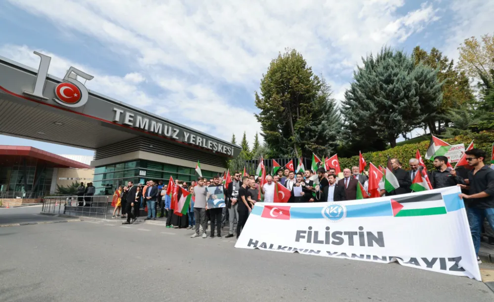 Akademik ve idari personelin de destek verdiği yürüyüşte topluluk üyeleri 5 Temmuz Yerleşkesi'nde Türkiye, Filistin bayrakları ve pankartlarla toplandı.