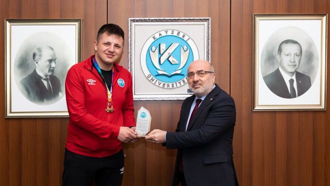 KAYÜ Rektörü Prof. Dr. Kurtuluş Karamustafa, başarılı sporcu Yılmaz Kılnamaz’ı şampiyonadaki başarısından dolayı kutladı ve kendisine plaket takdim etti.
