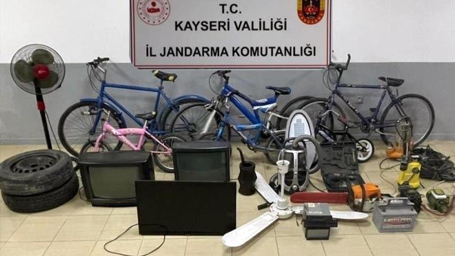 Kayseri İl Jandarma Komutanlığı İstihbarat Şube Müdürlüğü, KOM Şube Müdürlüğü ve Melikgazi İlçe Jandarma Komutanlığı tarafından uyuşturucu ve uyarıcı madde kullanmak ve bulundurma suçlarıyla ilgili istihbari çalışma başlatıldı. Yapılan çalışmalarda Melikgazi ilçesinde bir ikamette yapılan aramalarda 5 gram uyuşturucu madde bulundu. Ayrıca ekiplerin ev içerisinde yaptıkları aramalarda da hırsızlık malı olduğu değerlendirilen tavan pervanesi, hızar motoru, araç teybi, araç lastiği, projektör, elektrik süpürgesi, su motoru, matkap, dalgıç pompa ve kaynak makinesi, 3 adet televizyon ve 6 adet bisiklet bulunarak muhafaza altına alındı.