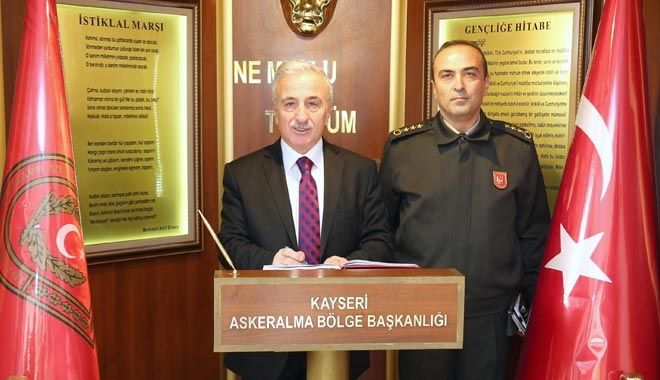 Asker Alma Bölge Başkanlığı önünde Albay Soylu ve personel tarafından karşılanan Vali Kamçı, ilk olarak Şeref defterini imzaladı.
