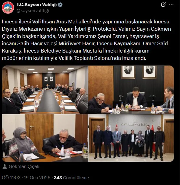 Kayseri’nin İncesu ilçesi İhsan Aras Mahallesi’nde yapımına başlanacak İncesu Diyaliz Merkezi için Yapım İşbirliği Protokolü imzalandı. Kayseri Valisi Gökmen Çiçek, imza törenini sosyal medya hesabından duyurdu.