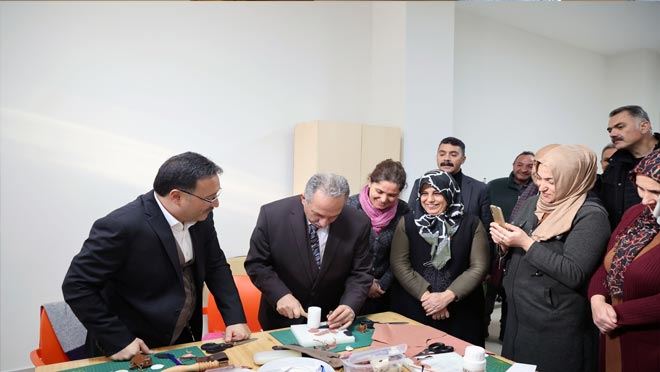 Burada üretim yapan kadınlarla görüşen heyet deriden yapılan ürünleri yakından inceledi. Bir ara tezgaha da geçen Vali Çiçek ve Başkan Yalçın ellerine tokmak ve çivi alarak çanta yapımı için parça derilere delik açıp törpüledi. Kadınlardan tam not alan Başkan Yalçın için, ‘sanat okulu öğretmeni olduğu belli oldu’ esprileri yapıldı.