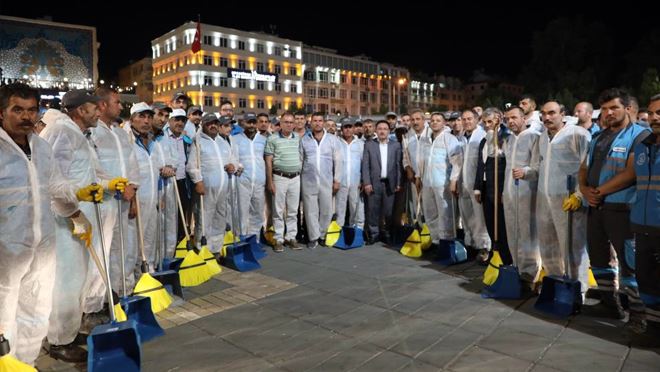 Vali Gökmen Çiçek, gece geç saatlerinde valilik binasından çıkarken Cumhuriyet Meydanı’nda temizlik çalışması yapan Kocasinan Belediyesi işçilerine sürpriz yaparak, onları ziyaret etti ve şükranlarını sundu.