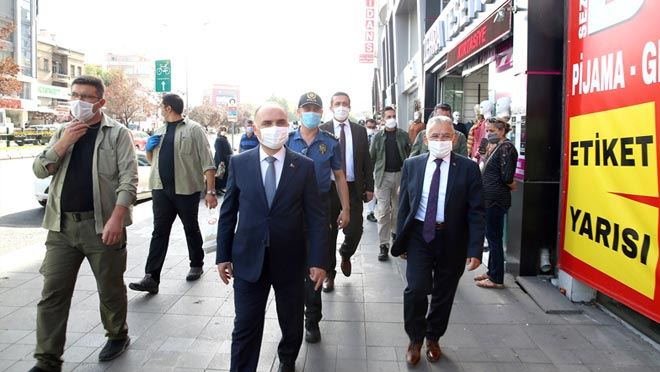 Vali Şehmus Günaydın ve Büyükşehir Belediye Başkanı Memduh Büyükkılıç ile birlikte Covid-19 ile mücadele çalışmaları kapsamında pastırma dükkanlarının yoğunlukta bulunduğu Kadınlar Çarşısı ile Millet ve Düvenönü caddelerinde denetimlere katıldılar.