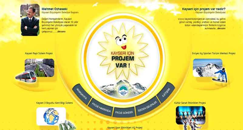 Kayseri Büyükşehir Belediyesi yepyeni bir internet sitesini hizmete sundu. Bilgi Teknolojileri Şube Müdürlüğü tarafından hazırlanan www.kayseriicinprojemvar.com sitesi, Kayseri halkını şehre katkı sağlamaya ve hizmetlere yön vermeye davet ediyor.