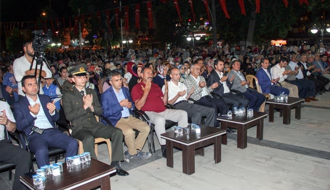 İstiklal Marşımız ve Kuran-ı Kerim´in okunması ile başlayan programda İlçe Müftüsü Dursun Sarı´nın yaptırdığı duanın ardından meydanı dolduran vatandaşlara hitap eden Başkan Esat Öztürk, ?Türk milletinin yeniden diriliş tarihi olan 15 Temmuz´un anlam ve ruhuna uygun etkinlik yapmak üzere bu meydandayız. Şehitlerimize hatimler, Yasinler, Fatihalar göndermek, gazilerimize vefa sunmak, 15 Temmuz ruhunu diri tutmak, Demokrasi ve Milli Birlik günümüzde bir olmak, iri olmak, diri olmak için buradayız.? dedi.
