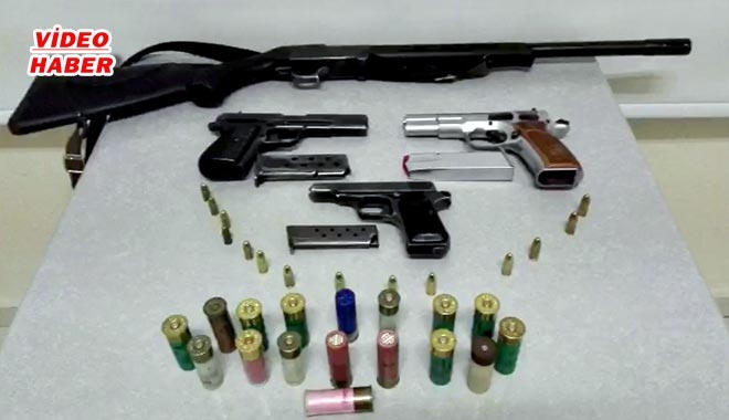 Adreste yapılan aramada 7 ruhsatsız tabanca, 7 şarjör ve 60 mermi ile bir av tüfeği ele geçirildi.