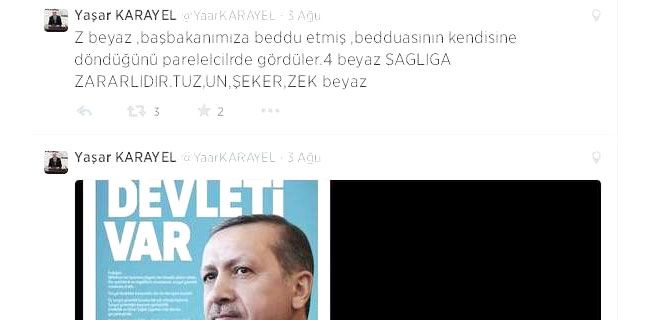 AK Parti Kayseri Milletvekili Yaşar Karayel, Başbakan`a beddua eden Zekeriya BEyaz`a twitter hesabından tepki gösterdi. Yaşan Karayel, twitter hesabında, "Z beyaz, başbakanımıza beddu etmiş, bedduasının kendisine döndüğünü parelelcilrde gördüler.4 beyaz SAGLIGA ZARARLIDIR.TUZ,UN,ŞEKER,ZEK beyaz" yazarak tepki gösterdi.