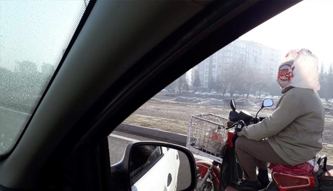 Kayseri´de Kocasinan Bulvarı´nda seyreden sürücüler, bir motosiklet kullanıcısının kafasında kask yerine poşet olduğunu görünce çok şaşırdı. Durumu gören vatandaşlardan biri o anları cep telefonu ile kaydetti. Seyir halinde gördüğü manzarayı kaydeden vatandaş, "Niye kask takmadın?" diye sorduğu motosiklet sürücüsü, "Yeni çıktı" diye cevap verdi.