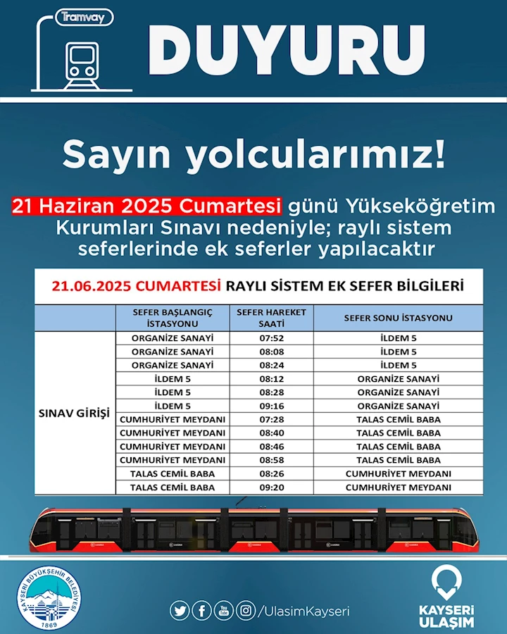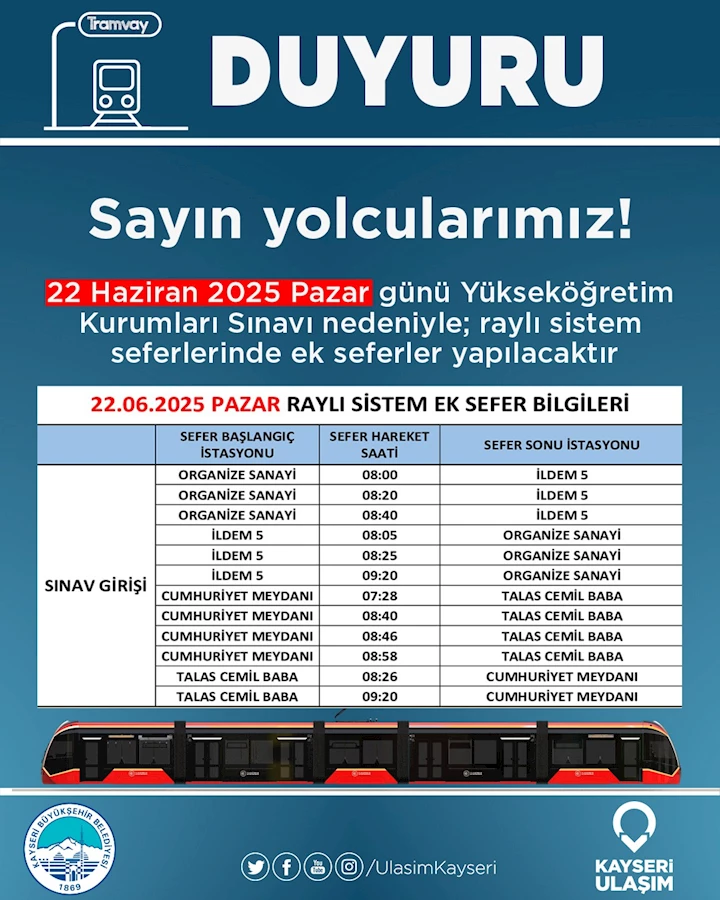 Büyükşehir Belediyesinden yapılan açıklamaya göre, 21-22 Haziran tarihlerinde sınav giriş belgelerini gösteren öğrencilerin toplu taşıma araçlarını ücretsiz kullanabilmesi sağlanacak.