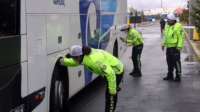Kayseri'de polis ekipleri tarafından yapılan uygulamalarda, terminalden çıkış yapan yolcu otobüslerinin kışlık lastikleri denetlendi.