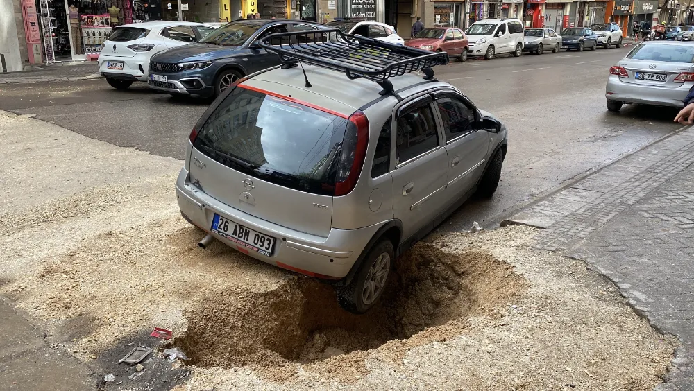 Kentte etkili olan yağış nedeniyle yumuşayan zeminde bir süre sonra yaklaşık yarım metre derinliğinde ve 2 metre uzunluğunda çukur oluştu. Park halindeki otomobilin arka sağ lastiği çukura düştü.
