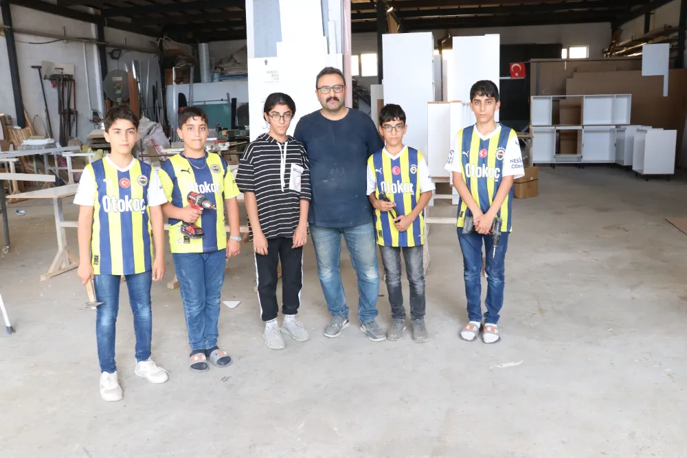 Gönül verdikleri Fenerbahçe'nin sarı-lacivert formalarını giyen kardeşler, iş yerinde genel temizlik, taşıma ve küçük montaj işlerinde babalarına yardımcı oluyor.